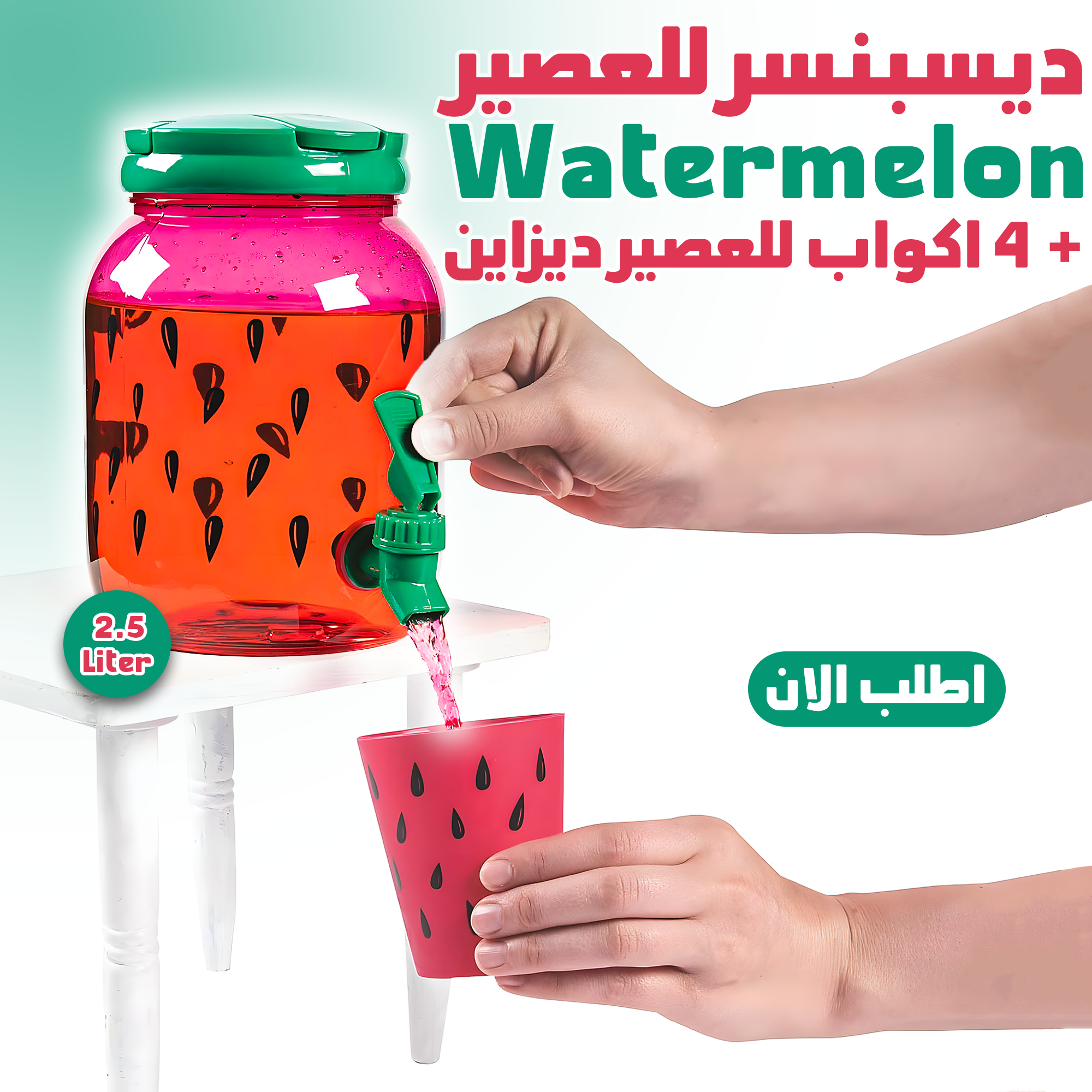 حلي جو حفلاتك وصيفك مع ديسبنسر العصير بتصميم البطيخ + 4 كبايات شيك! 🍉👌 مثالي لكل التجمعات والمناسبات، ودايمًا جاهز يضيف البهجة لكل لحظة